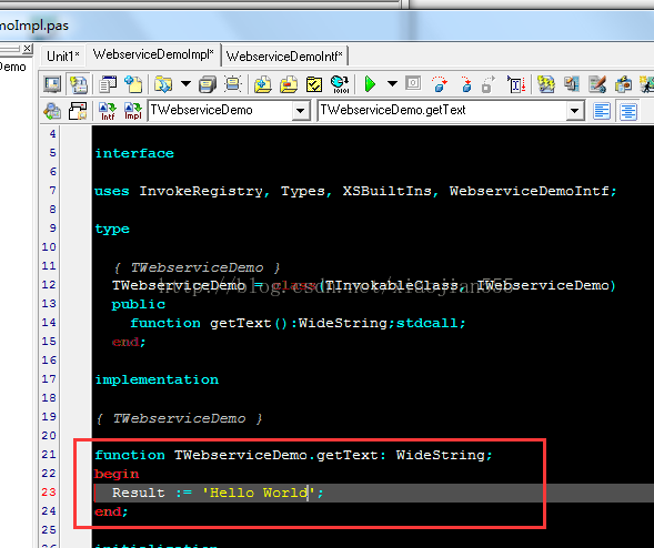 在WebserviceDemoIntf中编写自定义函数(注意一定要加上stdcall):