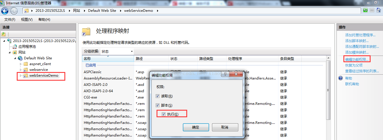 10.选择虚拟目录,双击处理程序映射,选择右边编辑功能权限,勾选执行: