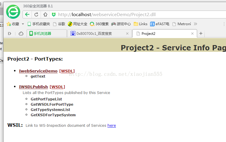 11.在浏览器中输入http://localhost/webserviceDemo/Project2.dll,显示界面如下: