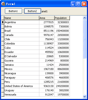 unit Unit1; interface uses Windows, Messages, SysUtils, Variants, Classes, Graphics, Controls, Forms, Dialogs, StdCtrls, ExtCtrls, Grids, DBGrids, DB, ADODB; type TForm1 = class(TForm) Panel1: TPanel; Button1: TButton; Button2: TButton; DBGrid1: TDBGrid; DataSource1: TDataSource; ADODataSet1: TADODataSet; procedure FormCreate(Sender: TObject); procedure Button1Click(Sender: TObject); procedure Button2Click(Sender: TObject); end; var Form1: TForm1; implementation {$R *.dfm} procedure TForm1.Button1Click(Sender: TObject); begin with ADODataSet1 do begin Close; CommandText := 'SELECT Name FROM country'; Open; end; end; procedure TForm1.Button2Click(Sender: TObject); begin with ADODataSet1 do begin Close; CommandText := 'SELECT Name,Area,Population FROM country'; Open; end; end; procedure TForm1.FormCreate(Sender: TObject); var mdbFile: string; begin mdbFile := GetEnvironmentVariable('COMMONPROGRAMFILES'); mdbFile := mdbFile + '\CodeGear Shared\Data\dbdemos.mdb'; ADODataSet1.ConnectionString := 'Provider=Microsoft.Jet.OLEDB.4.0;Data Source=' + mdbFile + ';Persist Security Info=False'; DBGrid1.DataSource := DataSource1; DataSource1.DataSet := ADODataSet1; end; end.